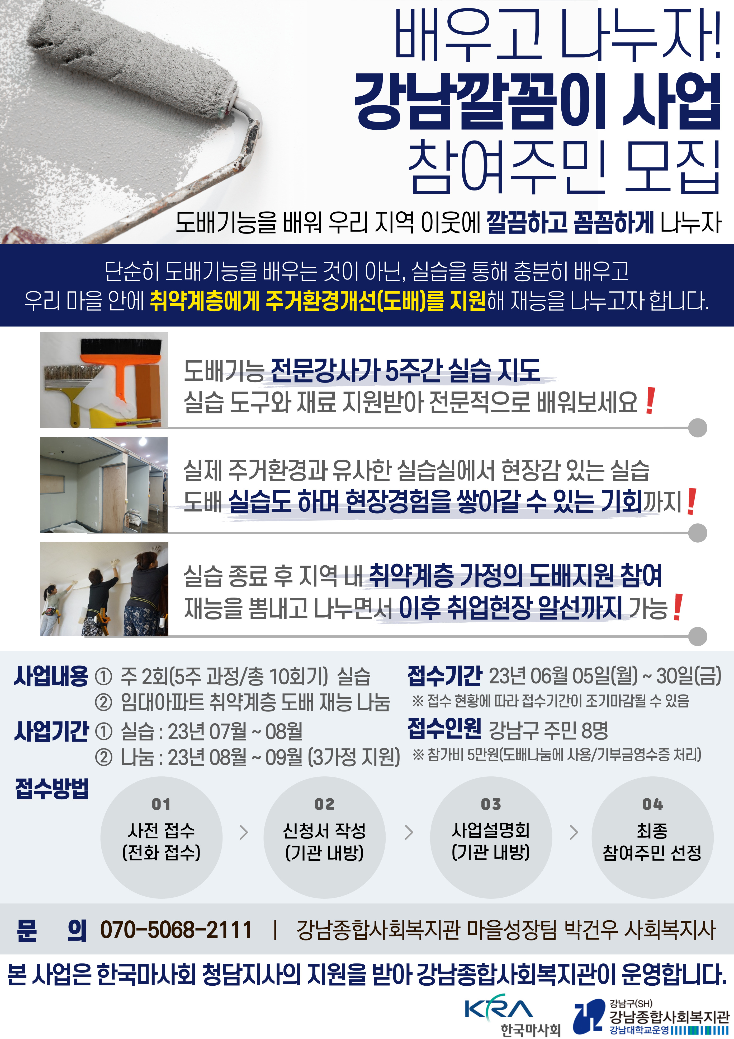 접수 및 문의 연락처 : 070-5068-2111 (강남종합사회복지관 박건우 사회복지사)